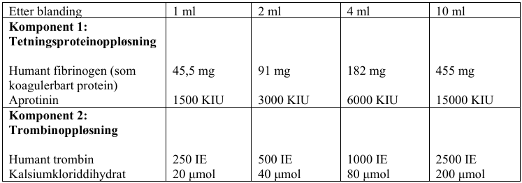 Virkestoff: Aprotinin, Fibrinogen, Kalsiumklorid, Trombin