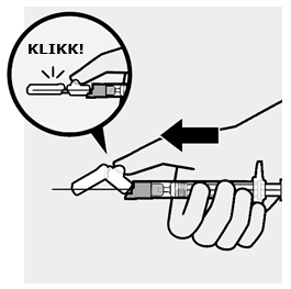 Etter at injeksjonen er fullført, bruk tommelen eller en rett flate til å sikre kanylen i sikkerhetsmekanismen. Kanylen er sikret når det høres et “klikk”.