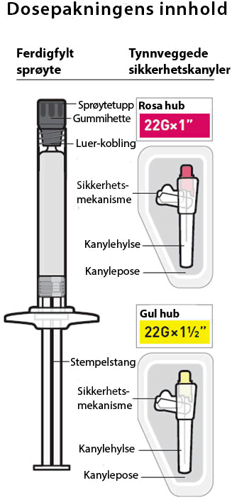 Hver pakning inneholder 1 ferdigfylt sprøyte og 2 kanyler.