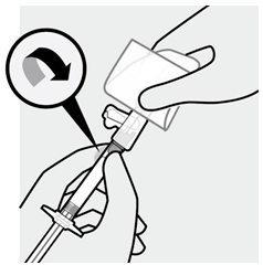 Åpne først kanyleposen ved å rive dekslet halvveis av. Legg det på en ren overflate. Hold deretter sprøyten pekende oppover, vri og dra av gummihetten.