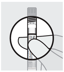 Etter risting av sprøyten i minst 15 sekunder, sjekk suspensjonens utseende i inspeksjonsvinduet. Suspensjonen skal være homogen og melkehvit på fargen.