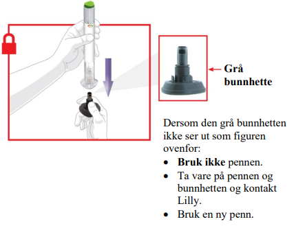 Ikke fjern bunnhetten og ikke bruk pennen. Kast pennen som anvist av lege, apotek eller sykepleier. Injisér dosen din med en annen penn.