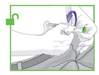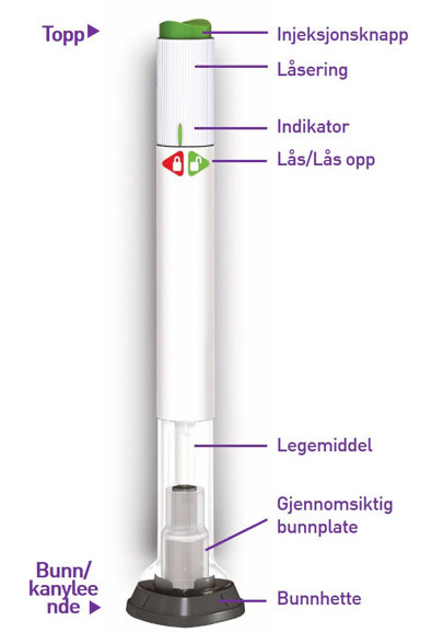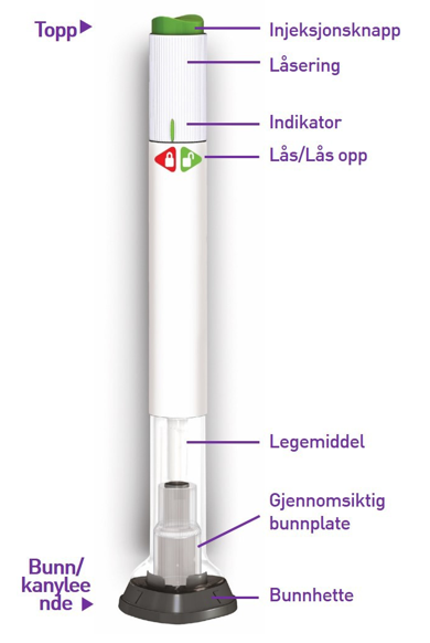 Når du presser inn den grønne injeksjonsknappen vil pennen automatisk føre kanylen inn under huden din, injisere legemidlet og trekke tilbake kanylen etter at injeksjonen er fullført.