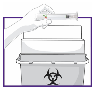 Kast pennen i en beholder som kan lukkes og der kanylen ikke kan stikke igjennom, eller slik lege, apotek eller sykepleier har anvist.
