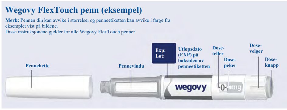 Før du begynner å bruke Wegovy FlexTouch penn én gang per uke, må du alltid lese disse instruksjonene nøye, og snakke med lege, sykepleier eller apotek om hvordan du skal injisere Wegovy riktig.