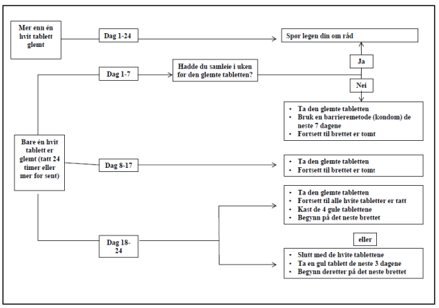 Dette pakningsvedlegget beskriver situasjoner der du bør slutte med p-pillen, eller der p-pillens beskyttelse mot graviditet kan være nedsatt. I slike situasjoner bør du ikke ha samleie eller du bør ta ekstra ikke-hormonelle preventive forholdsregler, f.eks. bruke kondom eller annen barrieremetode. Bruk ikke rytme- eller temperaturmetoder. Disse metodene beskytter kanskje ikke mot graviditet fordi p-pillen forandrer de vanlige endringene i kroppstemperatur og i slimhinnen i livmorhalsen som forekommer i løpet av menstruasjonssyklusen.