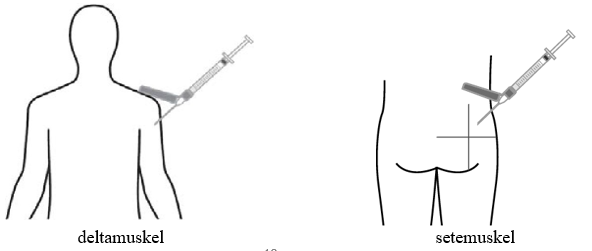 c) Injiser det anbefalte volumet som en enkel intramuskulær injeksjon i sete- eller deltamuskelen. Ikke masser injeksjonsstedet. Forsiktighet må utvises slik at utilsiktet injeksjon i blodkaret unngås. Injiser ikke på et sted med tegn på inflammasjon, hudskader, klumper og/eller blåmerker.