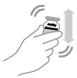 f) Plasser og hold hetteglasset til den rekonstituerte oppløsningen på en hard overflate. Sett adaptersprøyte-enheten på hetteglasset ved å ta tak i adapteren utvendig og skyve adapterens spiss bestemt gjennom gummiproppen til adapteren smekker på plass.