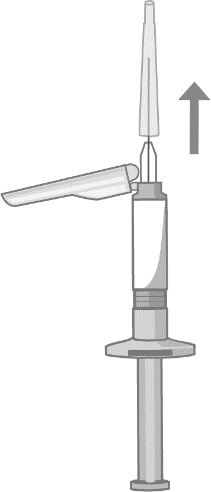 Når du er klar til å administrere injeksjonen, må du holde sprøyten loddrett og fjerne nålhetten ved å trekke den rett ut. Ikke vri nålhetten, da nålen kan løsne fra sprøyten.