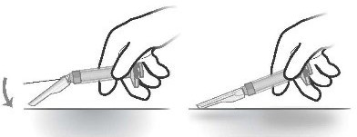 Etter injeksjon må du koble til nålbeskytteranordningen ved å skyve nålbeskytteren mot en hard overflate, for å dekke til og låse beskytteranordningen over nålen.
