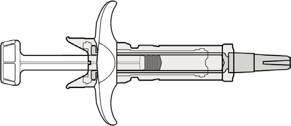Nålebeskyttelsen dekker nålen etter injeksjonen for å forhindre nålestikkskade. Dette påvirker ikke normal bruk av sprøyten. Trykk ned stempelstangen og trykk bestemt på slutten av injeksjonen for å forsikre at sprøyten tømmes helt. Hold godt fast i huden til injeksjonen er fullført. Hold sprøyten i ro og løft tommelen langsomt fra stempelstanghodet. Stempelstangen flyttes opp med tommelen, og fjæren trekker nålen ut fra stedet og inn i nålebeskyttelsen.
