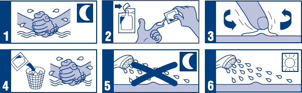 Etter påføringen kaster du den åpne posen. Vask hendene med såpe og vann.