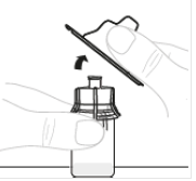 Trykk bestemt ned til adapteren smekker på plass. Spissen trenger igjennom proppen på hetteglasset.