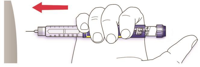 E. Trykk injeksjonsknappen helt inn. Kontroller at insulin kommer ut av kanylespissen.