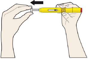 E. Når du er klar til å injisere, trekk den grå beskyttelseshetten rett av. Ikke la den grå hetten være av i mer enn 5 minutter. Hvis du lar den være av i mer enn 5 minutter, kan det tørke ut medisinen.