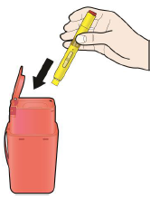 Kast den brukte ferdigfylte pennen i sprøytebeholderen umiddelbart etter bruk.