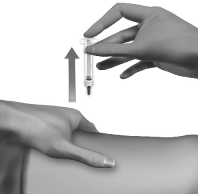 Trekk kanylen ut Hold huden stramt utstrukket eller klem sammen huden rundt injeksjonsstedet, og trekk kanylen ut. Hold en desinfeksjonsserviett på injeksjonsstedet, dersom du bruker dette. Sett et plaster på injeksjonsstedet hvis det er nødvendig. |