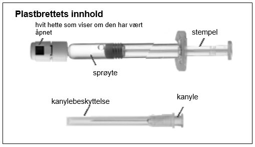 Trekk papirlokket helt av. Sjekk at blisterbrettet inneholder én ferdigfylt sprøyte og én injeksjonskanyle (se figuren “Plastbrettets innhold”).