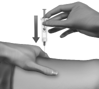 Sett injeksjonen Sett injeksjonskanylen med et raskt og målrettet stikk vinkelrett gjennom huden og inn i muskelen. Kanylen må trenge helt inn. Skyv stempelet langsomt inn til sprøyten er tom. Hvis du bruker en sprøyte med Avostartclip påmontert, får du en lavere dose av Avonex. Sprøyten tømmes ikke. |
