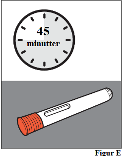 a. La den ferdigfylte pennen ligge i romtemperatur utenfor esken i 45 minutter ved 18 °C til 28 °C for å varme den opp (se figur E).