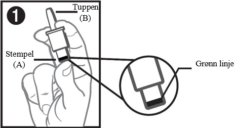 Trykk stemplet helt inn med tommelen. Dosen er fullstendig avgitt når den grønne linjen på stemplet ikke lenger er synlig.