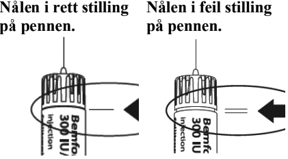 Forsiktig: Selv om det er gjenger i enden av pennen, må du aldri prøve å vri nålen på pennen , fordi nålen kan havne i feil stilling på pennen. Ikke trykk inn doseringsknappen mens du fester nålen.