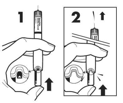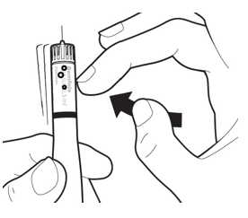 Mens du holder pennen slik at nålen peker oppover, trykk inn doseringsknappen til aktiveringsstreken forsvinner. Du vil også høre et klikk fra pennen, og en liten væskemengde spruter ut (dette er normalt). Pennen er nå klar til injisering av dosen.