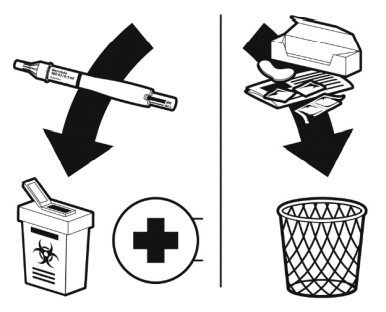 Kast pakningen, den indre nålehetten, den avrivbare fliken, spritservietten og bruksanvisningen i vanlig husholdningsavfall. Legemidler skal ikke kastes i avløpsvann eller sammen med husholdningsavfall. Brukte penner skal kastes i en egnet beholder for skarpe gjenstander og returneres til apoteket for forsvarlig destruksjon. Spør på apoteket hvordan du skal kaste legemidler som du ikke lenger bruker.