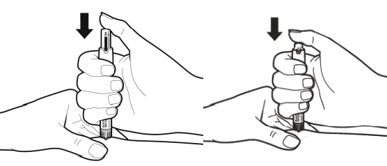 Først holder du pennen slik at nålen peker oppover. For å fjerne luftbobler fra systemet knipser du forsiktig på siden av pennen slik at eksisterende luftbobler stiger opp til toppen.