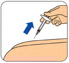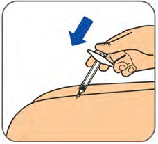 Klem og hold forsiktig fast det rengjorte hudområdet med en hånd. Hold den ferdigfylte sprøyten i en 45 graders vinkel mot huden. Med en rask, kort bevegelse, stikkes kanylen helt inn i huden.