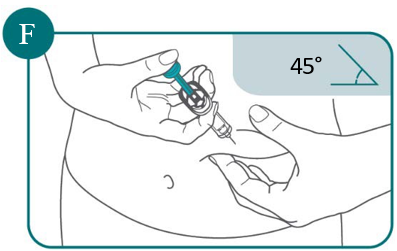 Skyv kanylen helt inn. Slipp deretter forsiktig taket i huden. Sørg for at kanylen er på plass (se figur F).