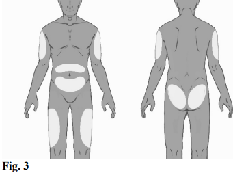Velg injeksjonssted. Injeksjoner skal roteres mellom steder på sete, lår, mage eller overarm (se fig. 3) med minst 8 uker mellom injeksjonene på et injeksjonssted som er brukt tidligere.