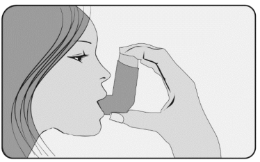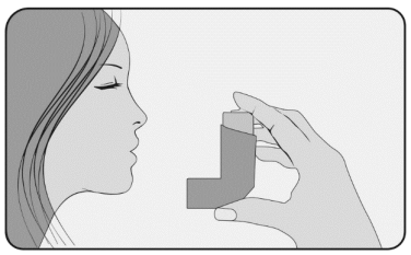 5. Rett etter at du starter å puste inn gjennom munnen, trykker du ned på toppen av inhalatoren med pekefingeren for å utløse en dose av legemidlet samtidig som du fortsatt puster sakte og dypt inn. Pass på at dosen med legemiddel ikke slipper ut på over- eller undersiden av munnen eller i munnvikene.