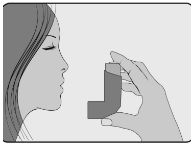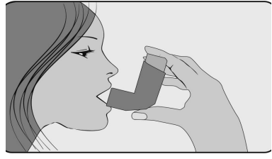 5. Rett etter at du starter å puste inn gjennom munnen, presser du ned på toppen av inhalatoren med pekefingeren for å utløse en dose av legemidlet, mens du fortsatt puster sakte og dypt inn. Pass på at dosen med legemiddel ikke slipper ut på over-, undersiden av munnen eller i munnvikene.