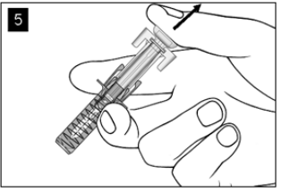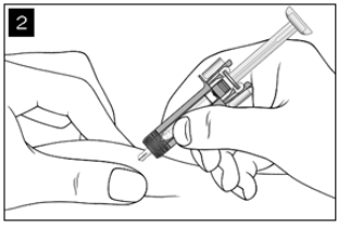 Hold sprøyten som vist. Trykk sakte stempelet inn så langt det går slik at stempelhodet når helt inn mellom sprøytebeskyttervingene.