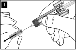 Ta forsiktig kanylehetten av sprøyten mens du holder på sprøytebeskytteren. Kast kanylehetten. Du kan muligens se en dråpe med væske på tuppen av kanylen. Dette er normalt.