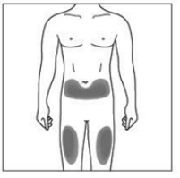 Ikke injiser i områder hvor huden er tynn, skadet, rød, skallete eller fortykket. Unngå områder med arr eller strekkmerker.