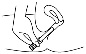 Du bør enten sitte eller ligge med bøyde knær når du skal plassere applikatoren. Den tynne enden av applikatoren skal føres forsiktig inn i vagina.