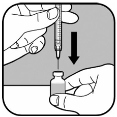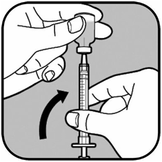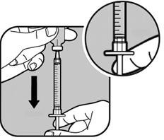 Trekk stemplet langsomt ut for å fylle sprøyten, til enden av stemplet er på linje med markeringen som tilsvarer din dose. Hold nålespissen i væsken hele tiden. |