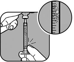 Trekk ut sprøytestemplet til enden av stemplet er på linje med markeringen som tilsvarer din dose. Sprøyten fylles da med luft. |