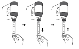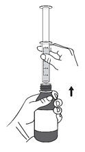 Trinn 4. Snu flasken opp-ned mens du holder sprøyten på plass. Skyv stempelet langsomt ned for å trekke inn en liten mengde mikstur. Skyv deretter stempelet helt opp for å fjerne luftbobler (se figur E).