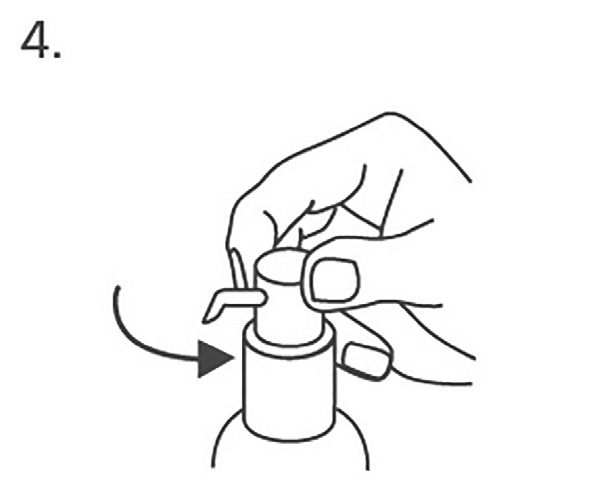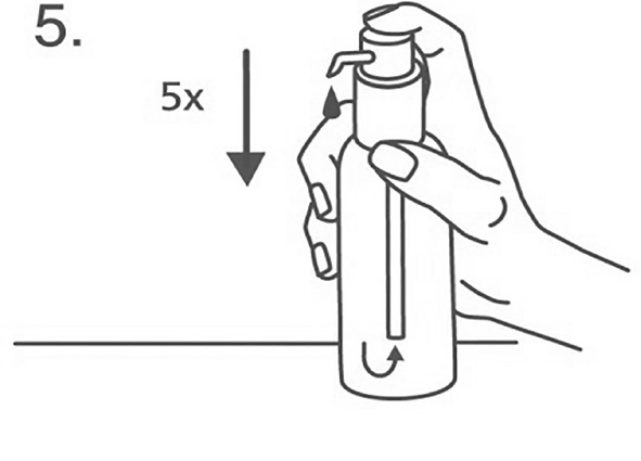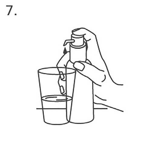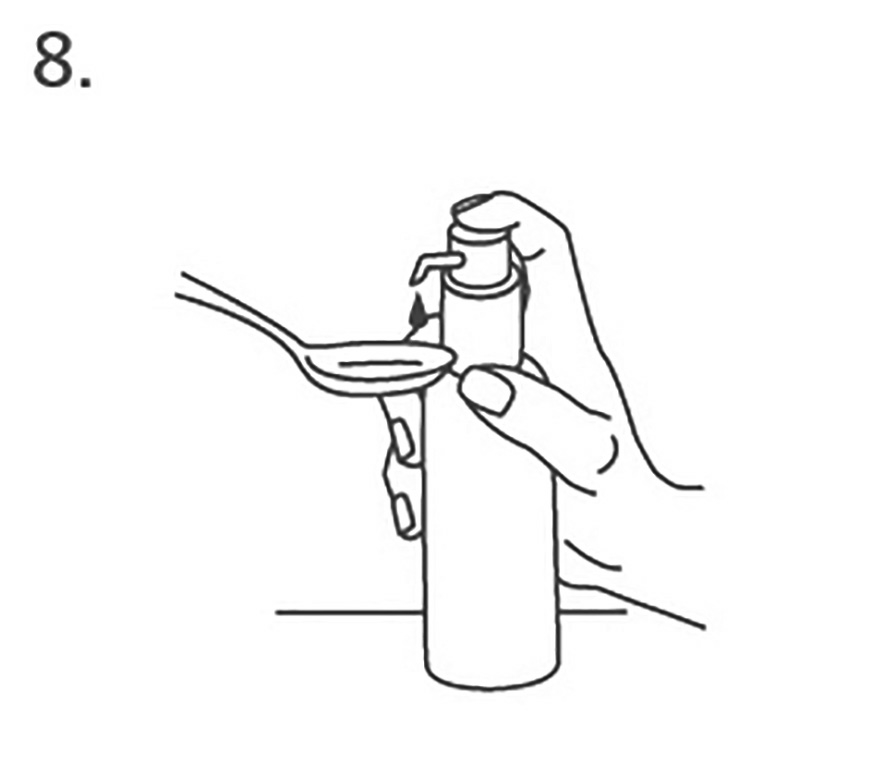 Flasken settes på en vannrett flate, for eksempel et bord, og skal kun brukes i loddrett stilling. Hold et glass med litt vann eller en skje under tuten og trykk pumpen rolig og bestemt ned, men ikke for langsomt (figur 7 og figur 8).