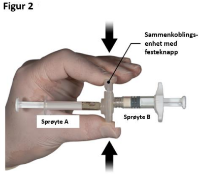 Grip tak i festeknappen på sammenkoblingsenheten med fingrene og tommelen din og trykk (figur 2) til du hører en klikkelyd. De to sprøytene ligger nå i flukt. Sprøytesystemet behøver ikke å holdes i noen spesiell posisjon for å aktivere tilkoblingsenheten. Ikke bøy sprøytesystemet (merk at dette kan gi lekkasje da sprøytene kan skrus delvis ut).