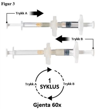 Hold sprøytene vannrett og overfør væskeinnholdet i sprøyte A inn i leuprorelinacetatpulveret i sprøyte B. Bland produktet godt i 60 sykluser ved å forsiktig dytte innholdet i begge sprøytene frem og tilbake mellom de to sprøytene (én syklus tilsvarer ett dytt med stempelet i sprøyte A og ett dytt med stempelet i sprøyte B) mens du holder systemet vannrett, for å oppnå en homogen, viskøs oppløsning (figur 3). Ikke bøy sprøytesystemet (merk a dette kan gi lekkasje da sprøytene kan skrus delvis ut).