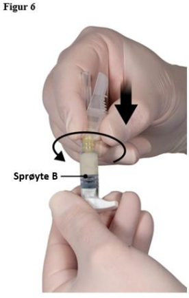 Injiser legemidlet ved å trykke stempelet sakte og jevnt ned til sprøyten er tømt. Påse at hele produktmengden i sprøyte B er injisert før du tar ut kanylen.