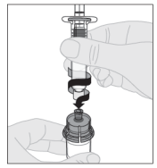 12. Med sprøyten fortsatt festet til adapteren og stempelstangen presset ned, roter hetteglasset forsiktig til pulveret er oppløst. Ikke rist.