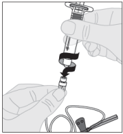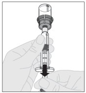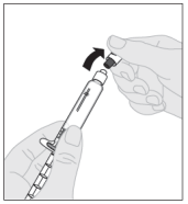 Merk: Dersom oppløsningen ikke skal brukes med én gang, kan sprøytehetten settes forsiktig tilbake på sprøytetuppen. Ikke berør sprøytetuppen eller innsiden av hetten.