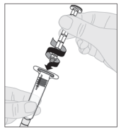 10. Fest sprøyten med væske til hetteglassadapteren ved å stikke sprøytetuppen inn i adapteråpningen. Skyv bestemt og skru sprøyten med klokken til den er godt festet.