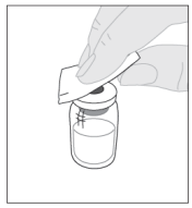 4. Tørk av toppen på hetteglasset med en av de desinfiserende serviettene (F) som følger med i pakningen, og la det lufttørke. Ikke berør toppen på hetteglasset og ikke la det komme i berøring med noe etter at det er tørket av.