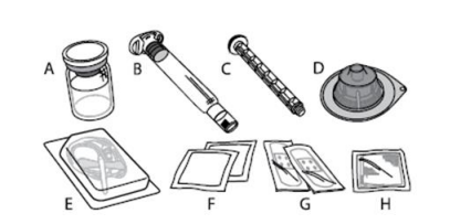 A) 1 hetteglass med pulver B) 3 ml væske i ferdigfylt sprøyte C) 1 stempelstang D) 1 hetteglassadapter E) 1 infusjonssett F) 2 desinfiserende servietter G) 2 plastre H) 1 gasbind |